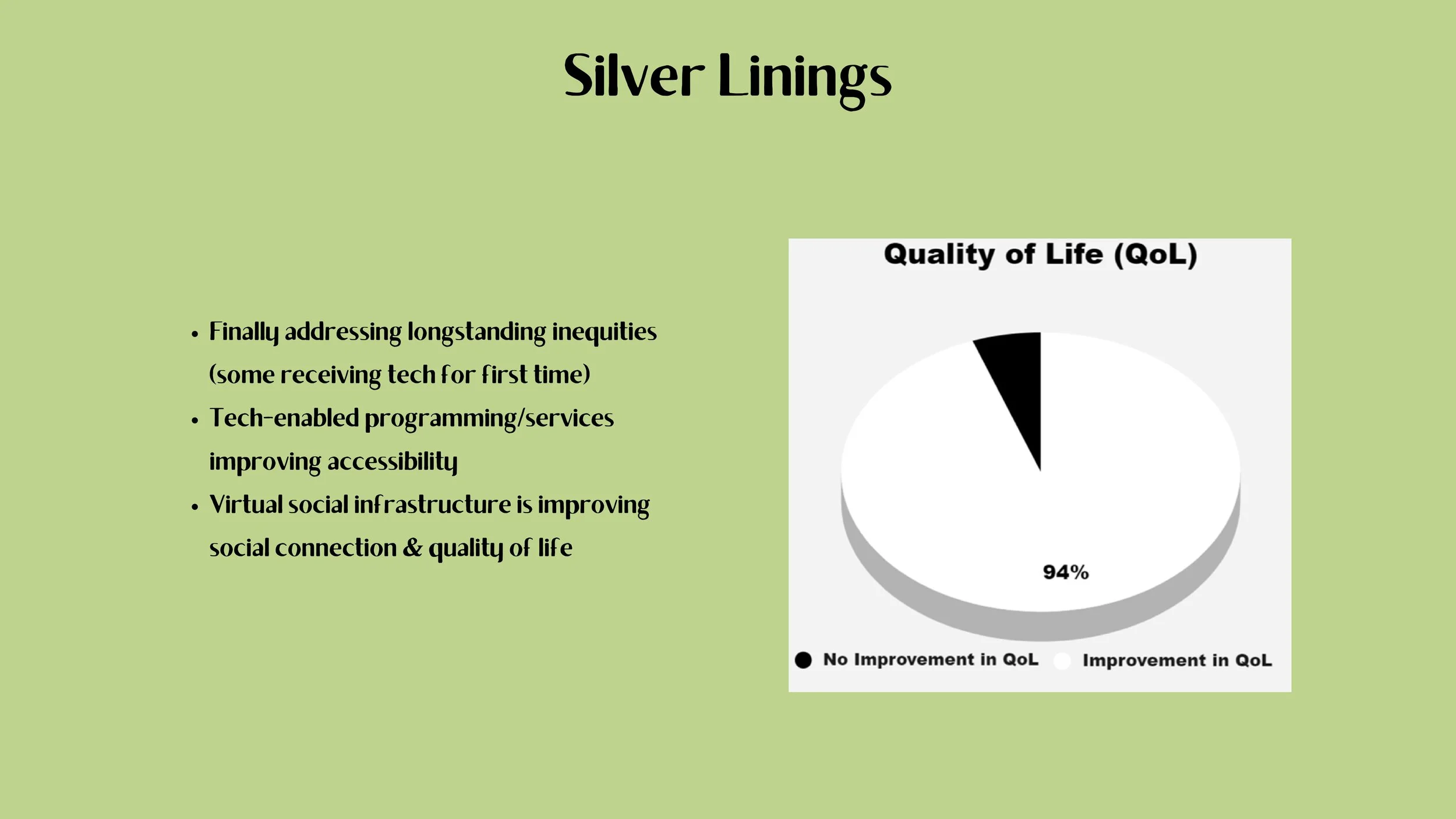 Furthermore, we are seeing that social infrastructure, even when constructed virtually, can improve social connection and quality of life, especially for historically underrepresented communities. For instance, 94% of participants in our longest running virtual program, Sitness—half of which are individuals with a disability—report that the program has improved their quality of life in the past year. I don’t know how many of you listening could say your quality of life has improved after the past year we’ve had, so I find this statistic to be incredibly powerful and revealing.