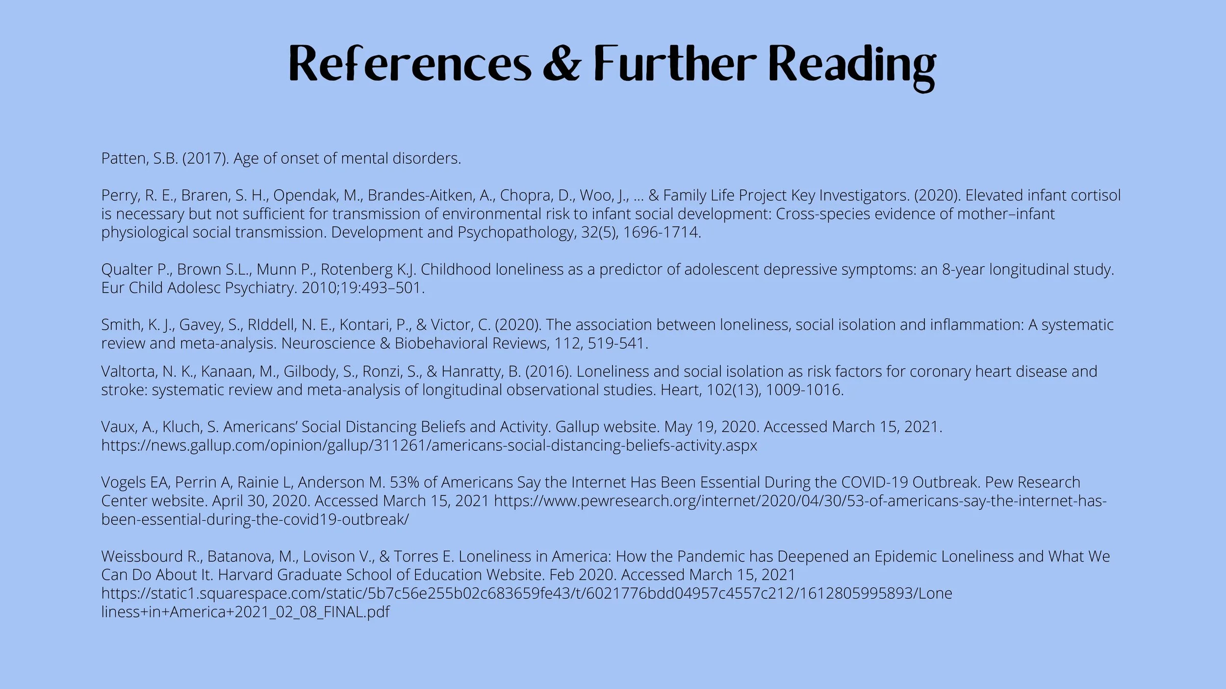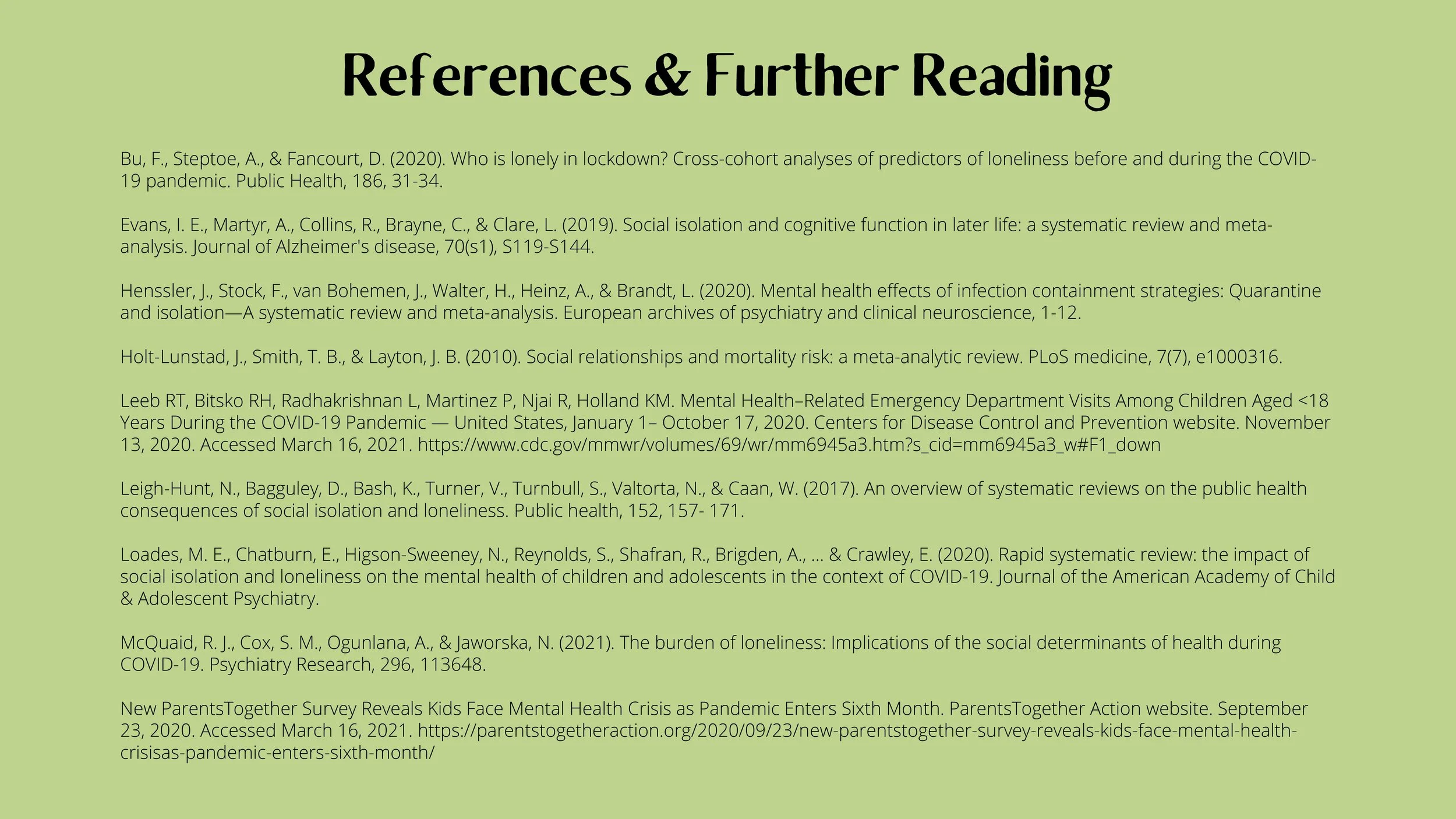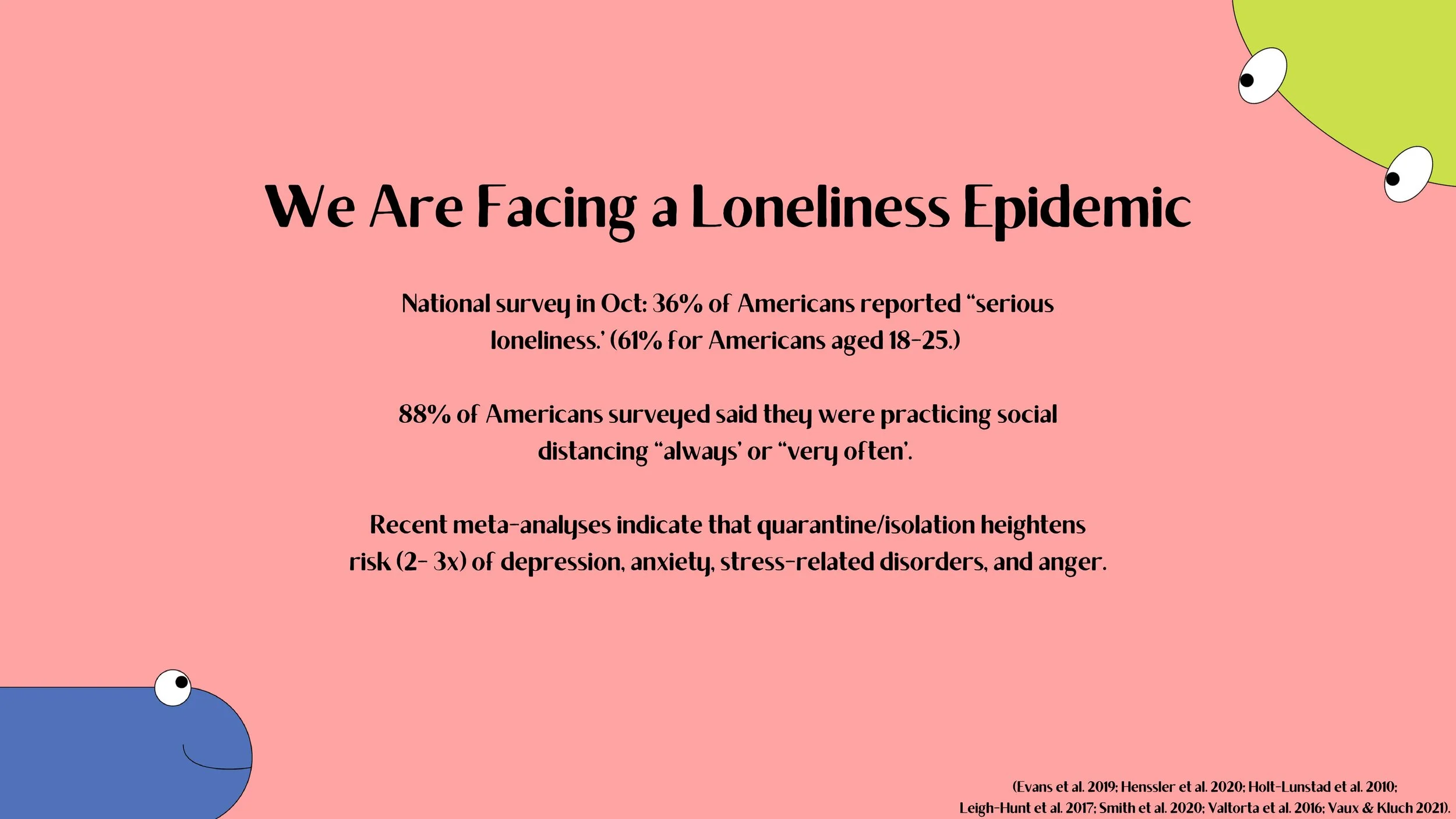 And as the pandemic continues, Americans are facing a loneliness epidemic. A national survey in October [2020] revealed that 36% of Americans reported “serious loneliness” and this rate is nearly doubled when you look at the data for young Americans aged 18-25. These findings are thought to be linked to social distancing practices, with 88% of Americans reporting they were practicing social distancing ‘always’ or ‘very often.’ Recent meta-analyses data also indicates that quarantine heightens the risk for depression, anxiety, stress-related disorders, and anger by two to three times.