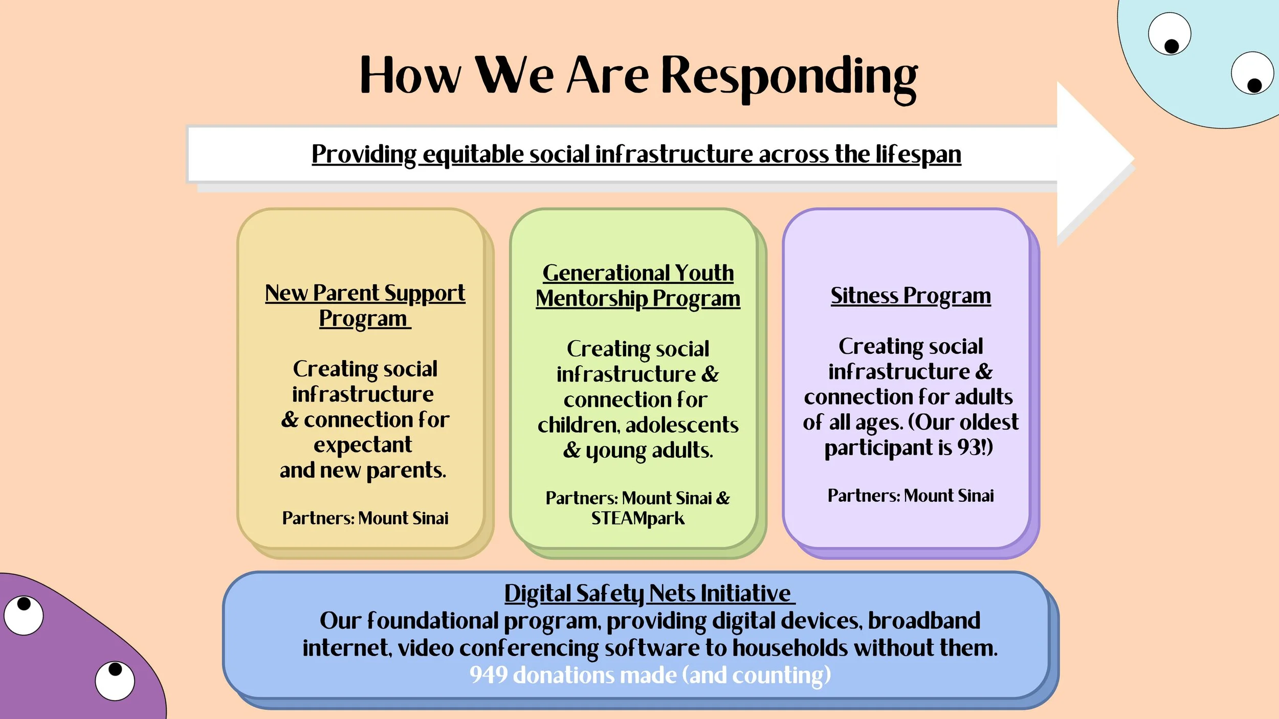 At Social Creatures, we have been working hard to provide support to families and children by rapidly creating social infrastructure that enables them to safely connect with loved ones and their communities via virtual programs. We are really trying to provide support across the whole lifespan, from birth with our new parent support program, into childhood and adolescence with our Generational Youth Mentorship program, and spanning into adulthood via our Sitness seated fitness group exercise program, where our oldest participant is 93. Foundational to all of our social infrastructure programs is our Digital Safety Nets initiative, which provides the necessary technology to support our program participants’ ability to access these programs.