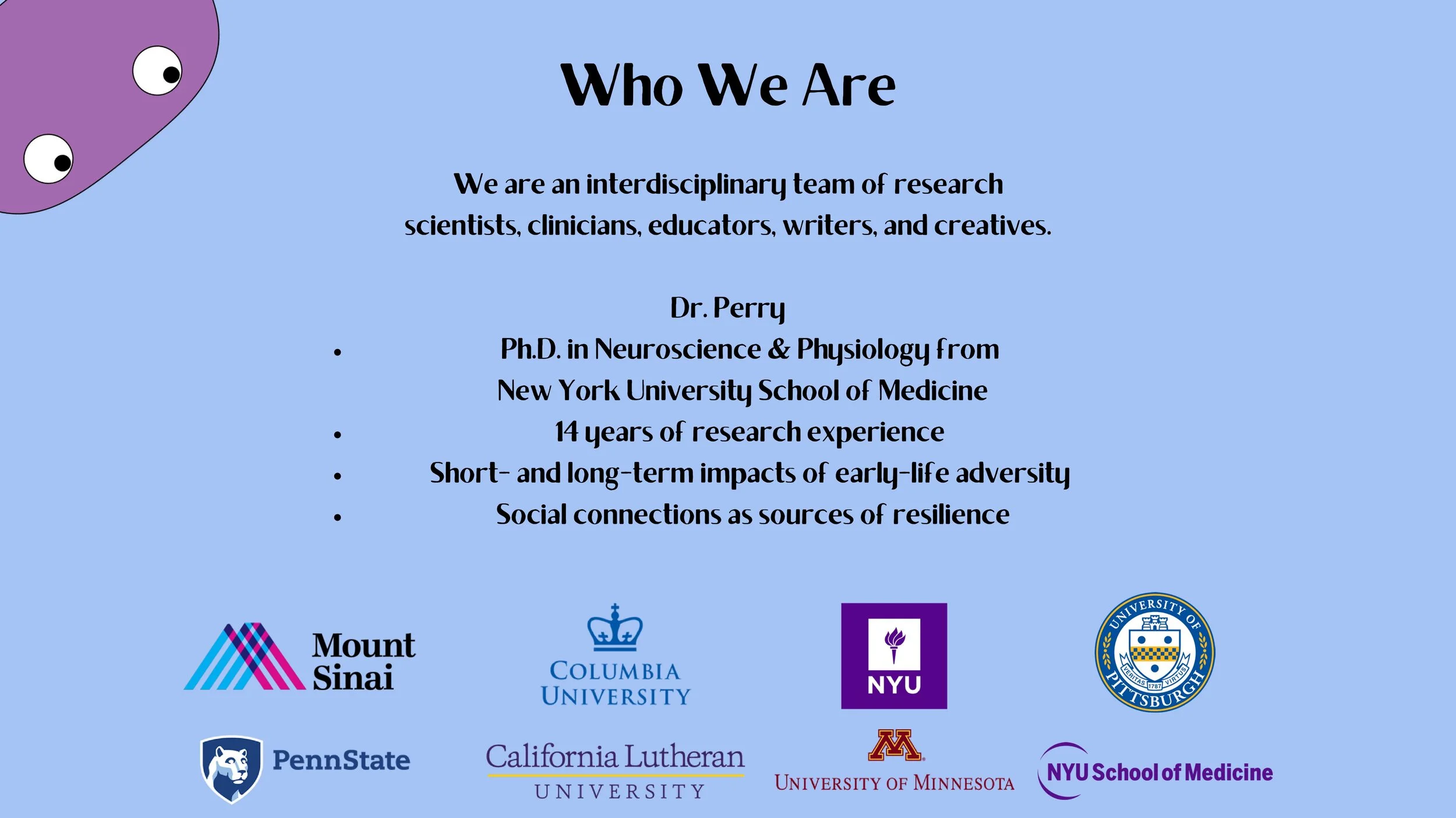 We are a highly interdisciplinary yet mission-aligned team, composed of research scientists, clinicians, educators, writers, and creatives from across the country. I myself am a social neuroscientist with a Ph.D. in Neuroscience and Physiology from New York University School of Medicine. My research has focused on the short- and long-term impacts of early life adversity on child development, with a heavy emphasis on how social connections can “get under the skin” to protect individuals from the long term, negative effects of stress and trauma.