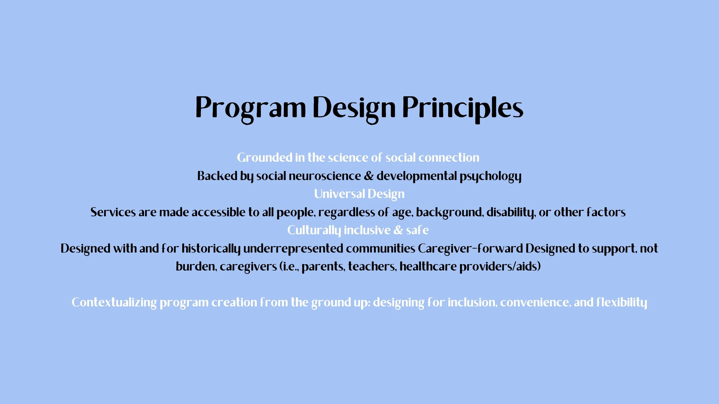 I really believe that the key to our success so far has been working closely with communities instead of for communities, to contextualize our program creation from the ground up. This led to the development of our core program design principles which I’ve listed on slide 12 for your reference. We work hard to make sure that our program inputs and activities are grounded in the science of social connection, but also incorporate Universal Design, cultural inclusivity and safety, and caregiver-forward practices that support rather than unintentionally burden our program participants and caregivers, whether they be parents, teachers or healthcare workers.
