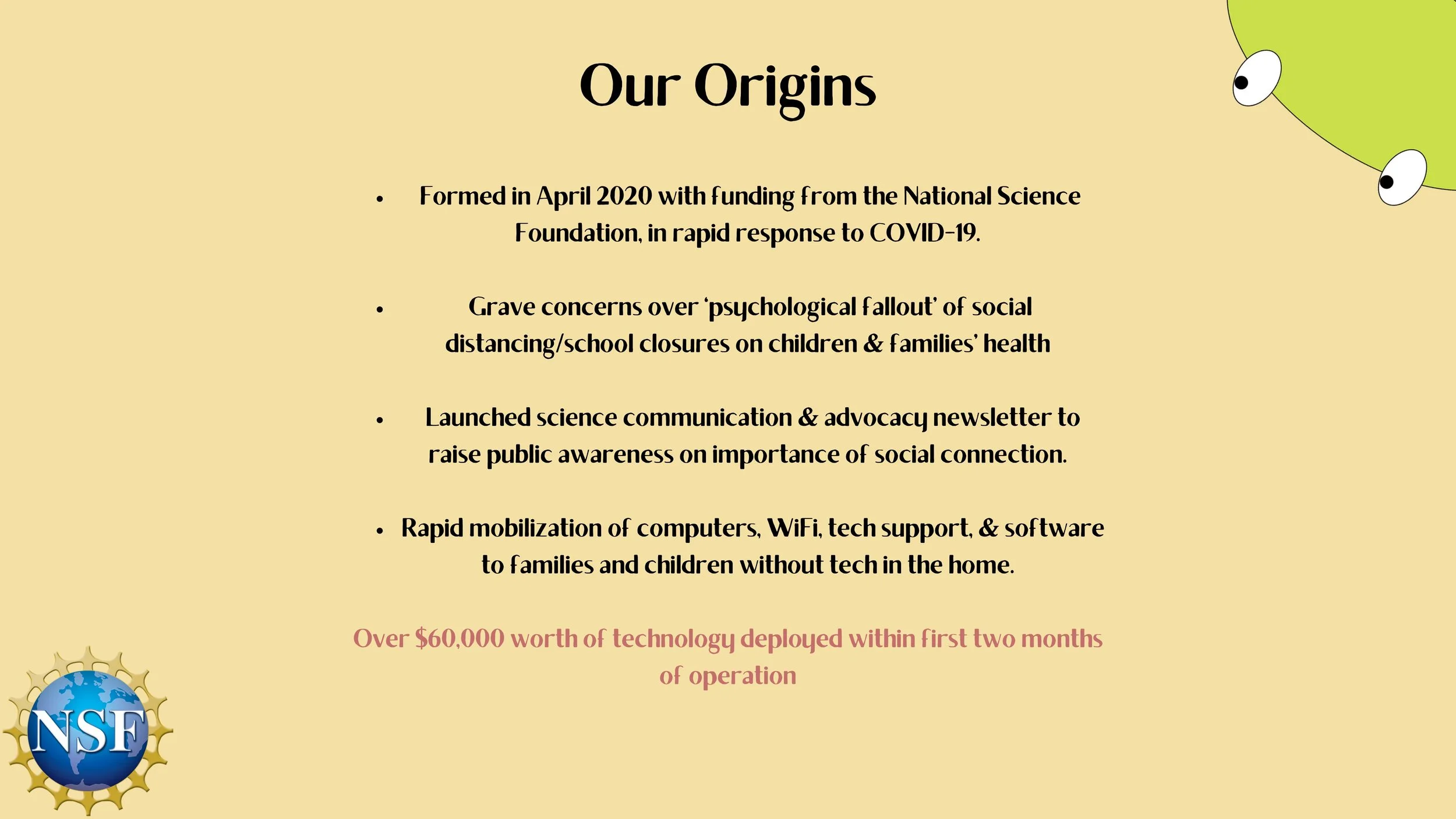 We are a fairly young organization. We launched last April [2020] with funding from the National Science Foundation, in rapid response to COVID-19. Specifically, we were very concerned about the psychological fallout of social distancing and school closures on child and family health. So we launched with a science communication and advocacy newsletter to educate on the importance of social connection, as well as mobilized donations of computers, WiFi, and tech support to families and children without technology in the home, to help them stay connected to their school, work, and communities.