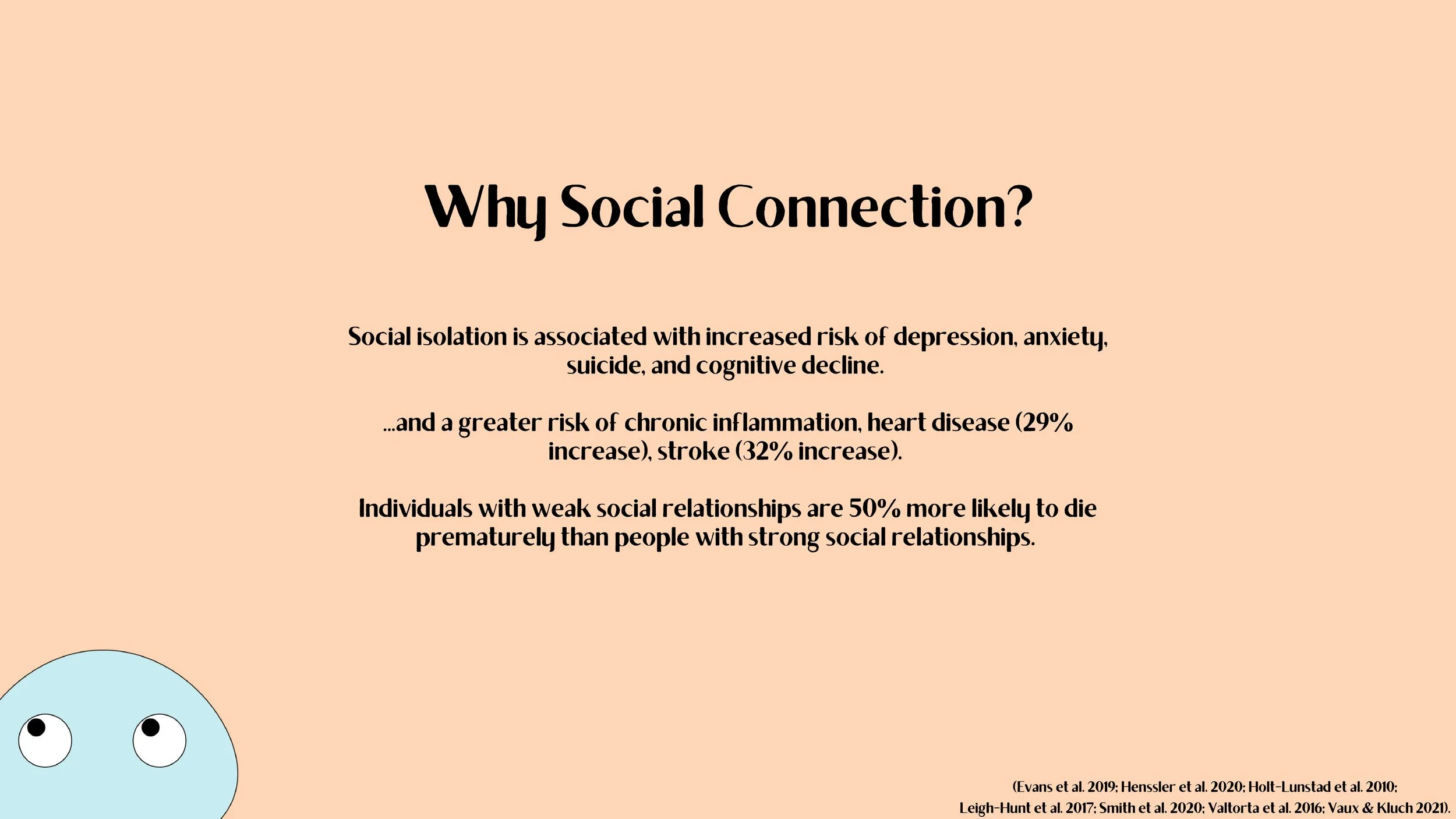 I’m sure after this past year it comes as no surprise to anyone that social connection is very important for our mental health and well being, but this is also backed by research linking social isolation to higher rates of depression, anxiety, suicide and even cognitive decline. However, what might come as more of a surprise to some of you is that social connection is also incredibly important for our physical health. Social isolation is associated with a greater risk of chronic inflammation, heart disease, and stroke. In fact, meta-analyses have shown that individuals with weak social relationships are 50% more likely to die prematurely than people with strong social relationships. So it even has been linked to our longevity.