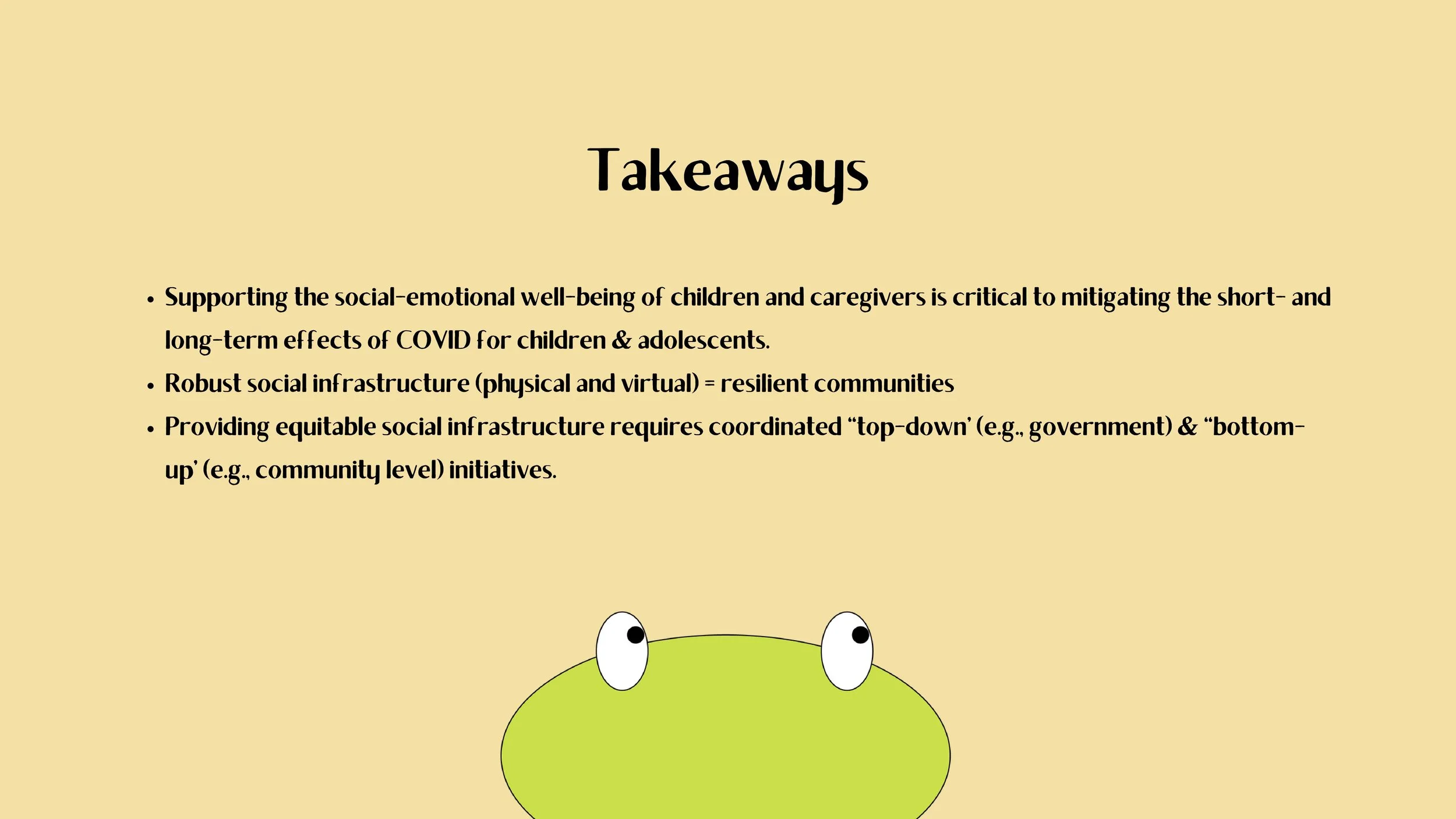 And finally, in order to ensure that this social infrastructure is provided equitably at scale, we really require coordinated efforts merging community-led initiatives with top down support via the government and centralized policies.